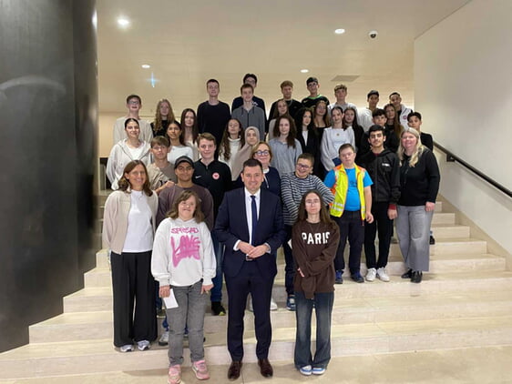 Dort wurden wir von einem netten jungen Mann des Besucherdienstes des Landtages willkommen geheißen und in den Plenarsaal geführt, wo wir alle auf den Sitzen der Landtagsabgeordneten Platz nehmen durften. Anschließend wurden die Grundsätze unserer parlamentarischen Demokratie besprochen und die Schülerinnen und Schüler konnten ihr Vorwissen aus dem Gemeinschaftskundeunterricht zum Besten geben. Anhand eines Rollenspiels zur Wahl des Ministerpräsidenten konnten wir alle Einblicke in den Alltag der Landtagsabgeordneten bekommen, das war sehr eindrücklich. Danach hatten wir noch eine ganze Stunde Zeit, in einem Raum für Ausschusssitzungen mit dem Landtagsabgeordneten unseres Wahlkreises Herrn Tobias Vogt über alle Fragen, die uns bewegten, zu reden. Sehr sympathisch und authentisch beantwortete der Kirchheimer alle Fragen der Jugendlichen. Diese interessierten sich für seine Hobbys, das Dienstfahrzeug und die Kommunalpolitik, aber auch seine Haltung gegenüber den USA und seine täglichen Aufgaben als Landespolitiker.