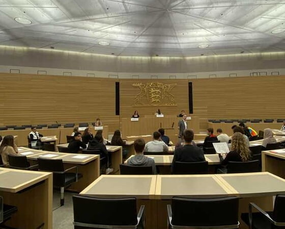 Am Freitag, 10. Oktober machte sich die gesamte Klassenstufe 9 mit ihren Lehrerinnen Frau Brett, Frau Reinprecht-Grün und Frau Haertel auf den Weg zum Landtag von Baden-Württemberg in Stuttgart. Die 37 Schülerinnen und Schüler aus den Klassen 9a, 9b und der Außenklasse der Paul-Aldinger-Schule fuhren mit dem Zug in die Landeshauptstadt.