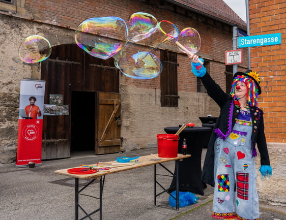 Außerdem stellte sich Claudia Schweikert als Clownin vor, die auf beeindruckende und einfühlsame Weise berichtete, wie sie durch ihr selbst gestaltetes Kostüm einen guten Zugang zu demenziell erkrankten Bewohnern findet. Vor der Kelter präsentierte sie Kunststücke mit Seifenblasen, die nicht nur die anwesenden Kinder zum Staunen brachten.