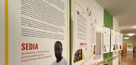 Am Donnerstag, 9.10.2025 um 19.00 Uhr fand bei uns die Eröffnung der Ausstellung „Damit das Leben weitergeht“ statt. Stephan Hennig, Sprecher der Ortsgruppe Seebrücke, führte in die Ausstellung ein. 12 Lebens-Schicksale werden dargestellt, vertrieben aus ihrem Heimatland, nach Deutschland geflohen. Eine eindrucksvolle Zusammenstellung von Erzählungen über Leid, lebensgefährliche Fluchtrouten, Ankunft, behördliche Schwierigkeiten, Hilfe von mitfühlenden Menschen, Erhalt von Arbeit und dem Aufbau eines neuen Lebens. Unter den Schicksalen findet sich auch Sedia Kijera, der bis zu seiner Ausweisung 2024 im Haus am Mühlbach als Altenpflegehelfer gearbeitet hat. Mahasan Issa, die mit ihrer Familie 2015 vor dem Krieg in Syrien nach Deutschland geflohen ist, arbeitet ebenfalls im Pflegedienst im Haus am Mühlbach. Die in Syrien ausgebildete OP-Schwester schilderte ihre Fluchterfahrungen und das Einleben in Deutschland. Voller Dank erwähnte sie Menschen in ihrem Umfeld, die ihr und ihrer Familie geholfen haben. Danke an Mahasan für diesen berührenden Bericht. Danke auch an Götz Schwarzkopf, der die Ausstellung im Foyer aufgebaut hat und für das Vortragen seines Liedes „Sedia“. Ebenfalls ganz herzlichen Dank den Besucherinnen und Besuchern der Ausstellungseröffnung. Die Ausstellung ist noch bis 23.10. im Foyer des Hauses am Mühlbach zu sehen.