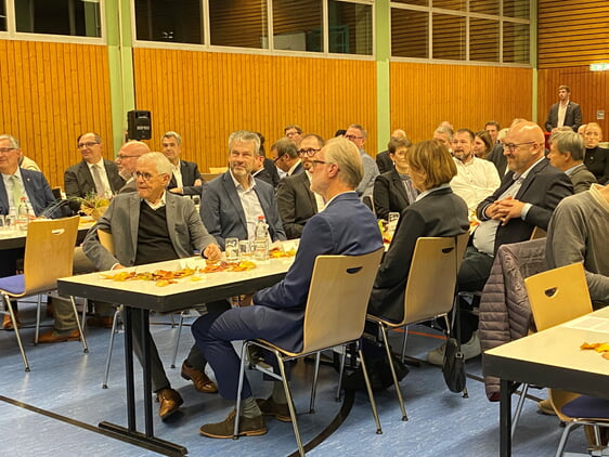 Innenminister Thomas Strobl griff die Anregungen auf und meinte, starke Kommunen bräuchten eine gewisse Größe, um den Herausforderungen gerecht zu werden. Er gratulierte dem Geburtstagskind zur gelungenen, „ersprießlichen“ Zusammenarbeit. Zunächst nahm er die Gäste mit zu einem Rückblick, in welcher Situation die Landesregierung die Gemeindeverwaltungsreform 1974 initiiert und durchgeführt hatte. Die bis dahin 3.379 Gemeinden Baden-Württembergs seien mit der Reform zu 1.111 Kommunen zusammengefasst worden. Von heute aus betrachtet, sei die Reform gelungen, denn die Selbstständigkeit kleinerer Gemeinden sei Dank des neuen Weges bewahrt geblieben und fördere eine vertrauensvolle interkommunale Zusammenarbeit. Gleichzeitig sei auch das Vertrauen in die Landespolitik wichtig. Um dies zu stärken, müsse das Land den Gemeinden in der derzeitigen Situation helfen. Deshalb wolle das Land zwei Drittel der Bundesgelder in Höhe von 8,75 Milliarden Euro 2026 für die Ganztagsbetreuung von Kindern an die Kommunen weiterreichen, antwortete der Innenminister auf Fragen aus dem Publikum. Weitere Gelder würden auch für das Bundesteilhabegesetz oder im Rahmen des Finanzausgleichs in die kommunalen Etats fließen. Nicht alle Probleme könnten sofort gelöst werden. Doch wolle das Land mit einer verpflichtenden Vorschule bei denjenigen einsteigen, die sie bräuchten. Strobl versicherte, er habe sich jüngst in Brüssel für eine kommunalfreundliche Finanzpolitik des Bundes eingesetzt.