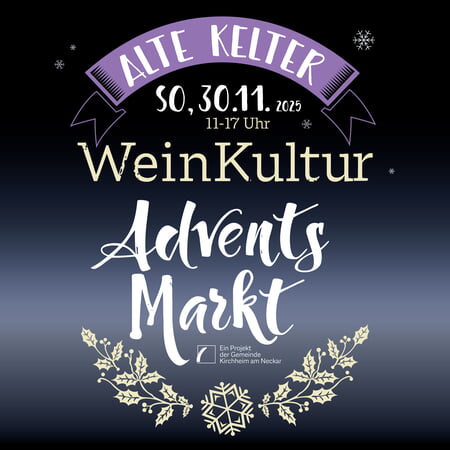 Der Advent rückt mit großen Schritten näher und damit auch der diesjährige Adventsmarkt der WeinKultur in der Alten Kelter Kirchheim am Neckar: am Sonntag, 30.11., von 11.00 bis 17.00 Uhr. Wie in den Jahren zuvor werden wieder vielfältige Genüsse und kunst- und liebevoll Handgefertigtes angeboten. Die warme Atmosphäre der Alten Kelter lädt bei allen Wettern zum Verweilen ein. Kommen Sie hungrig, durstig und geschenkesuchend oder einfach nur mit etwas Sehnsucht nach Entspannung, Weihnachten und lieben Leuten. Der Rest ergibt sich von allein, denn das hier gibt es zu entdecken: Weidenkörbe, Gestricktes, Kreationen aus Holz, Geschenkideen, Grußkarten; Eine-Welt-Laden, inkl. Schmuck; WeinKultur-Präsentation der neuen „La-Belle“-Abfüllung; leckere Bewirtung durch die Wurst-Braterei; Hospizdienst Neckar-Stromberg e.V.; „Werkstattwasser“, Brände; Weihnachtsgebäck der Landfrauen; Getränke, Punsch und Waffeln von der Schule auf dem Laiern.