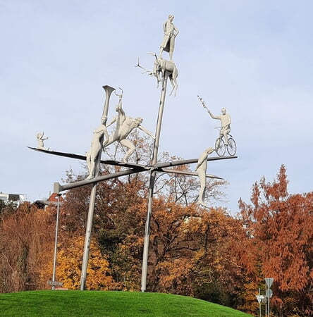 Vom Bahnhof ging es zum Hölderlin-Kunstwerk am Kreisverkehr. Dies zeugt von Hölderlins Leben und seinen Werken. In der Balance von Dichtkunst und Leben sind außer Hölderlin auch Goethe, Schiller, Herzog Carl-Eugen und Friedrich Nietzsche im Denkmal zu finden.