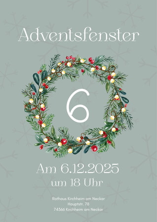 Am Samstag, 6. Dezember 2025 lädt die Gemeinde Kirchheim am Neckar herzlich zum Adventsfenster am Rathaus ein. Beginn ist um 18.00 Uhr.