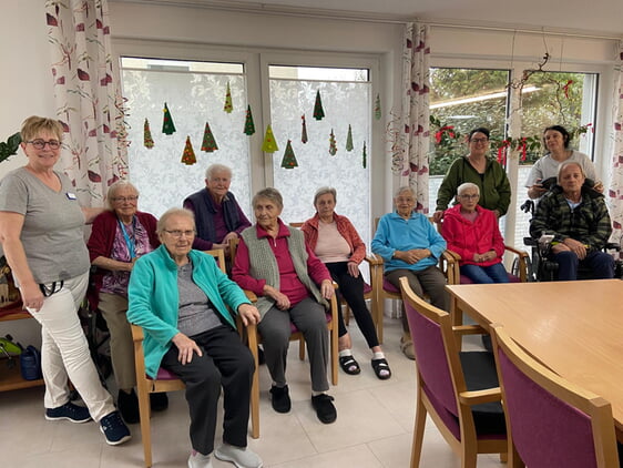 Dieses Mal sind es Weihnachtsbäume mit Chenille-Wolle umwickelt und mit bunten Pompons dekoriert, die nun in der Vorweihnachtszeit den Aufenthaltsraum in der Pflege-WG schmücken.
