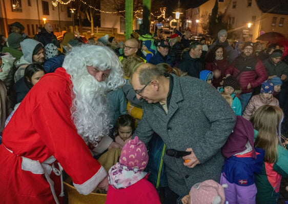 Der Höhepunkt des Abends war der Moment, als Bürgermeister Seibold die Kinder aufforderte, lautstark nach dem Nikolaus zu rufen. Und tatsächlich: Kaum waren die Rufe erklungen, erschien der Nikolaus mit einem großen Sack voller Geschenke. Jedes Kind durfte hineingreifen und sich über eine kleine Überraschung freuen.