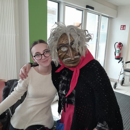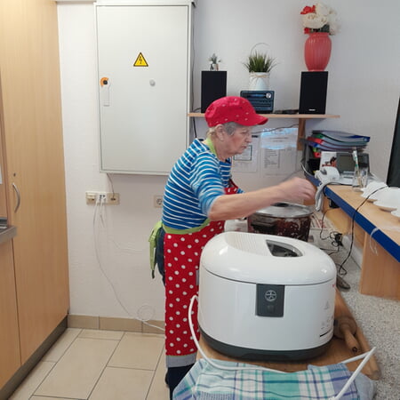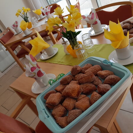 Am Faschingsdienstag wurde im Haus am Mühlbach traditionell gebacken. Uschi Gärtner, ehemals ehrenamtlich tätig, ließ es sich nicht nehmen, die Tradition weiterzuführen. Tatkräftig unterstützt wurde sie dabei von Konni Schuld. Danke an Uschi und Konni. Uschi brachte ihre Sachen mit und natürlich durfte ihr selbst gemachter Teig nicht fehlen. Aus insgesamt 3 kg Mehl wurden ca. 150 Stück Fasnetsküchle, ein Hefezopf auf dem Blech und ein Zopf in Kastenform gebacken. Fleißige Hände rollten den Teig aus, der danach in die entsprechende Größe der Küchle geschnitten wurde. Die Hefezöpfe wurden im Eingangsbereich im mobilen Backofen gebacken, sodass es durch das ganze Haus herrlich duftete. Das ließen wir uns natürlich nicht nehmen. Wir verzehrten und genossen die Küchle und den Zopf zu einer guten Tasse Kaffee. Es kam noch überraschender Besuch von einer „Mühlbach-Hexe“, die uns einen Besuch abstattete.