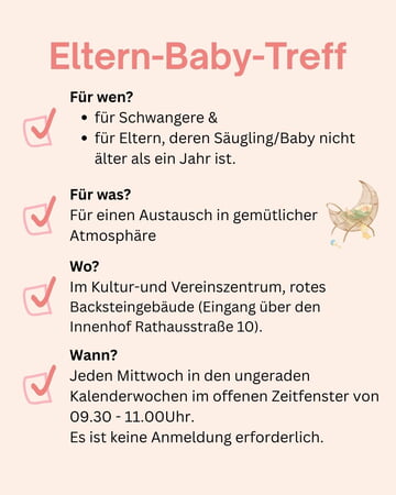 Am 8. April macht der Eltern-Baby-Treff eine Osterpause. Ab dem 22. April geht es im gewohnten Rhythmus weiter.
